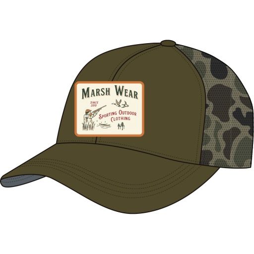 •6 Panel Structured Trucker •Cotton canvas •Marsh Wear Mallard Camo mesh •Mid profile fit with slightly curved bill •Snapback
